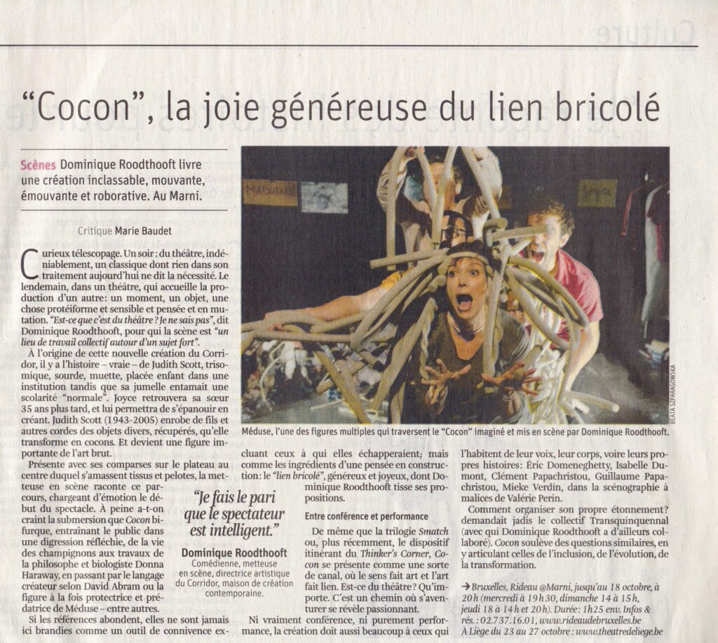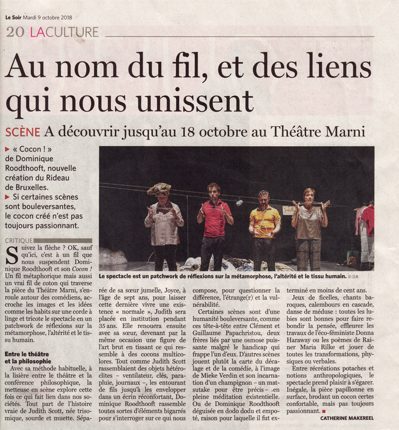 “Cocon”, la joie généreuse du lien bricolé, Marie Baudet , La Libre Belgique, 8/10/2018