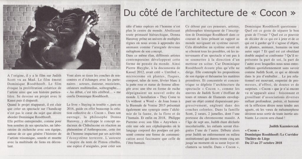 Cocon ! au Théâtre Marni : “Bougez-vous, bandes de larves, sortez de votre cocon !”, Dominique Mussche, RTBF, 12/10/2018