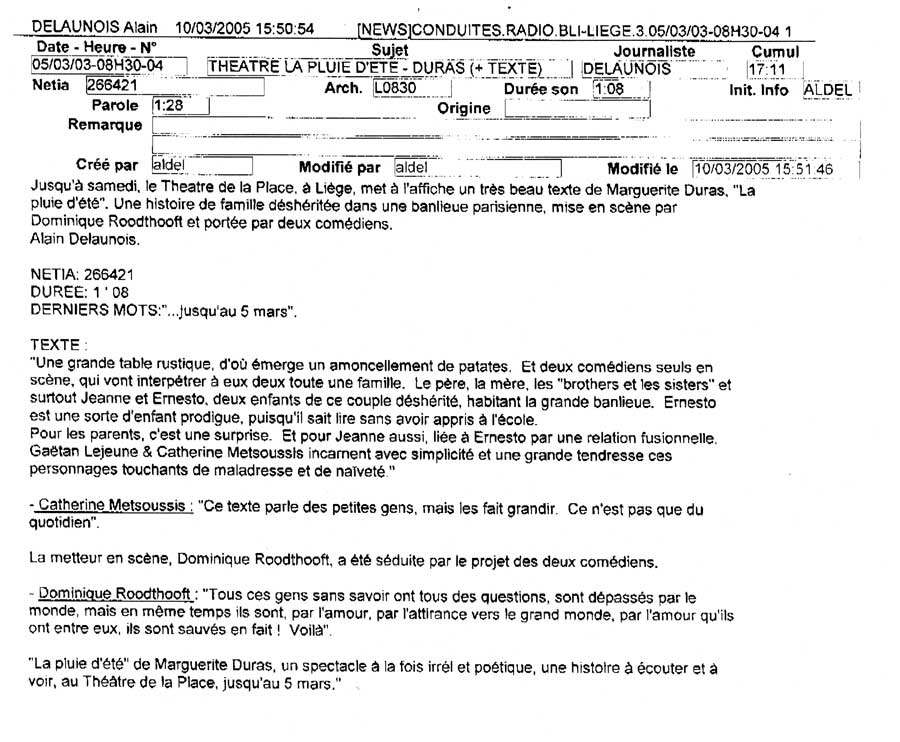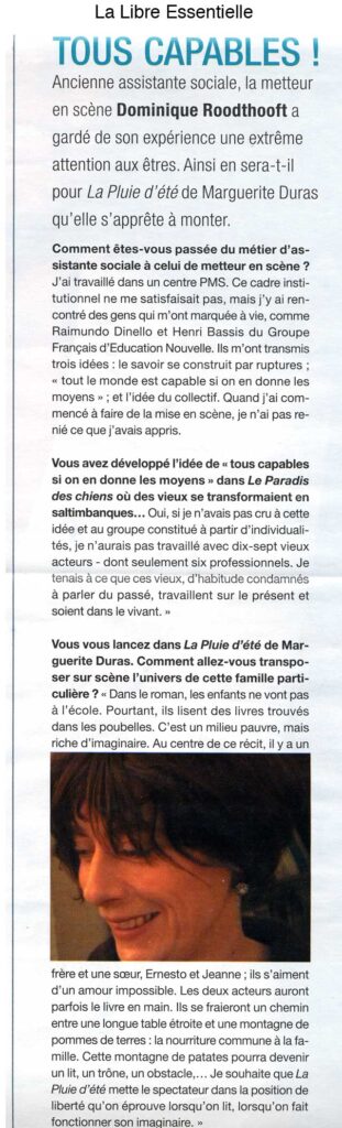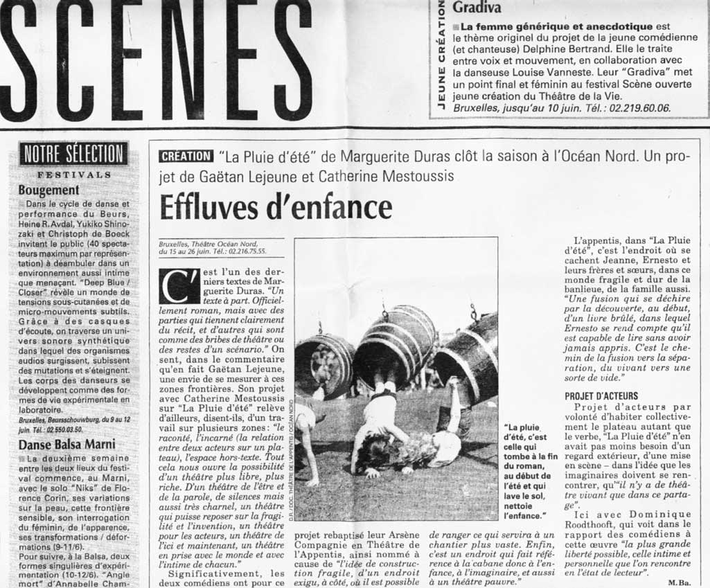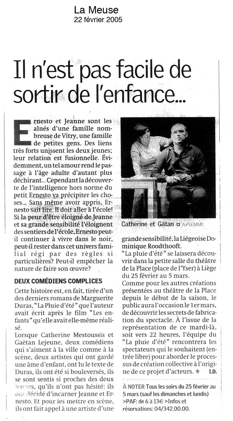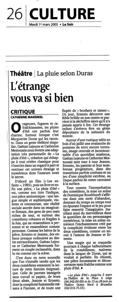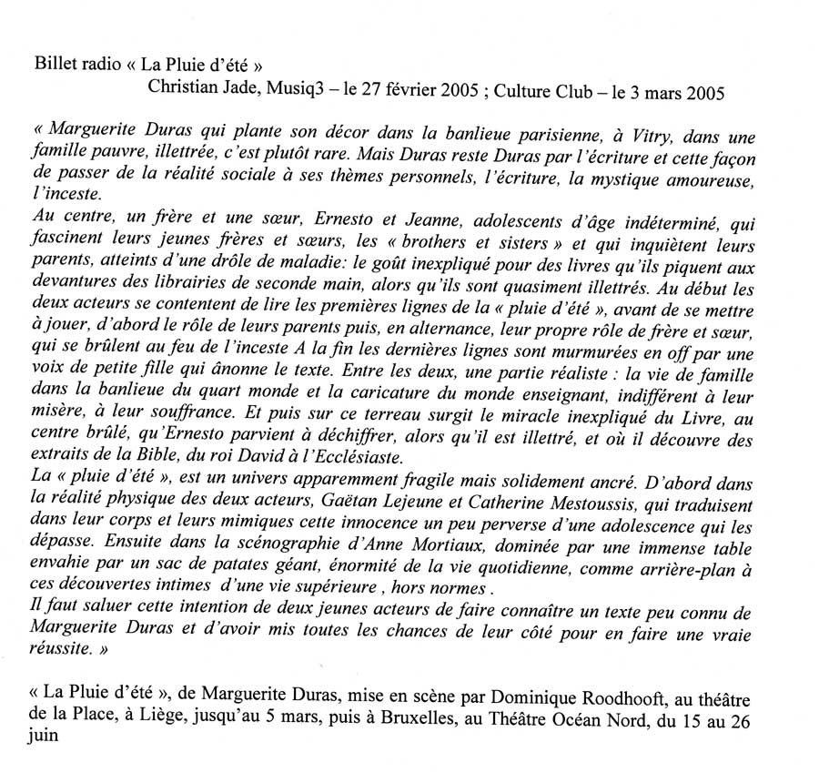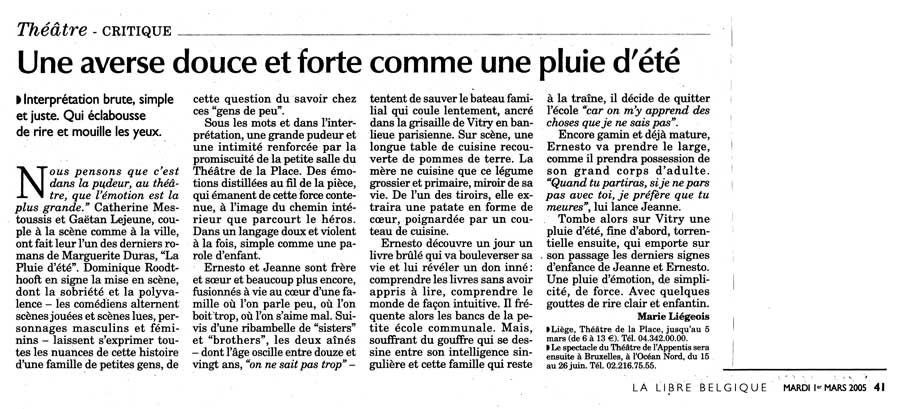 « … La « pluie d’été », est un univers apparemment fragile mais solidement ancre. D’abord dans la réalité physique des deux acteurs, Gaëtan Lejeune et Catherine Mestoussis, qui traduisent dans leur corps et leurs mimiques cette innocence un peu perverse d’une adolescence qui les dépasse. Ensuite dans la scénographie d’Anne Mortiaux, dominée par une immense table envahie par un sac de patates géant, énormité de la vie quotidienne, comme arrière-plan à ces découvertes intimes d’une vie supérieure, hors normes. II faut saluer cette intention de deux jeunes acteurs de faire connaître un texte peu connu de Marguerite Duras et d’avoir mis toutes les chances de leur côté pour en faire une vraie réussite. »