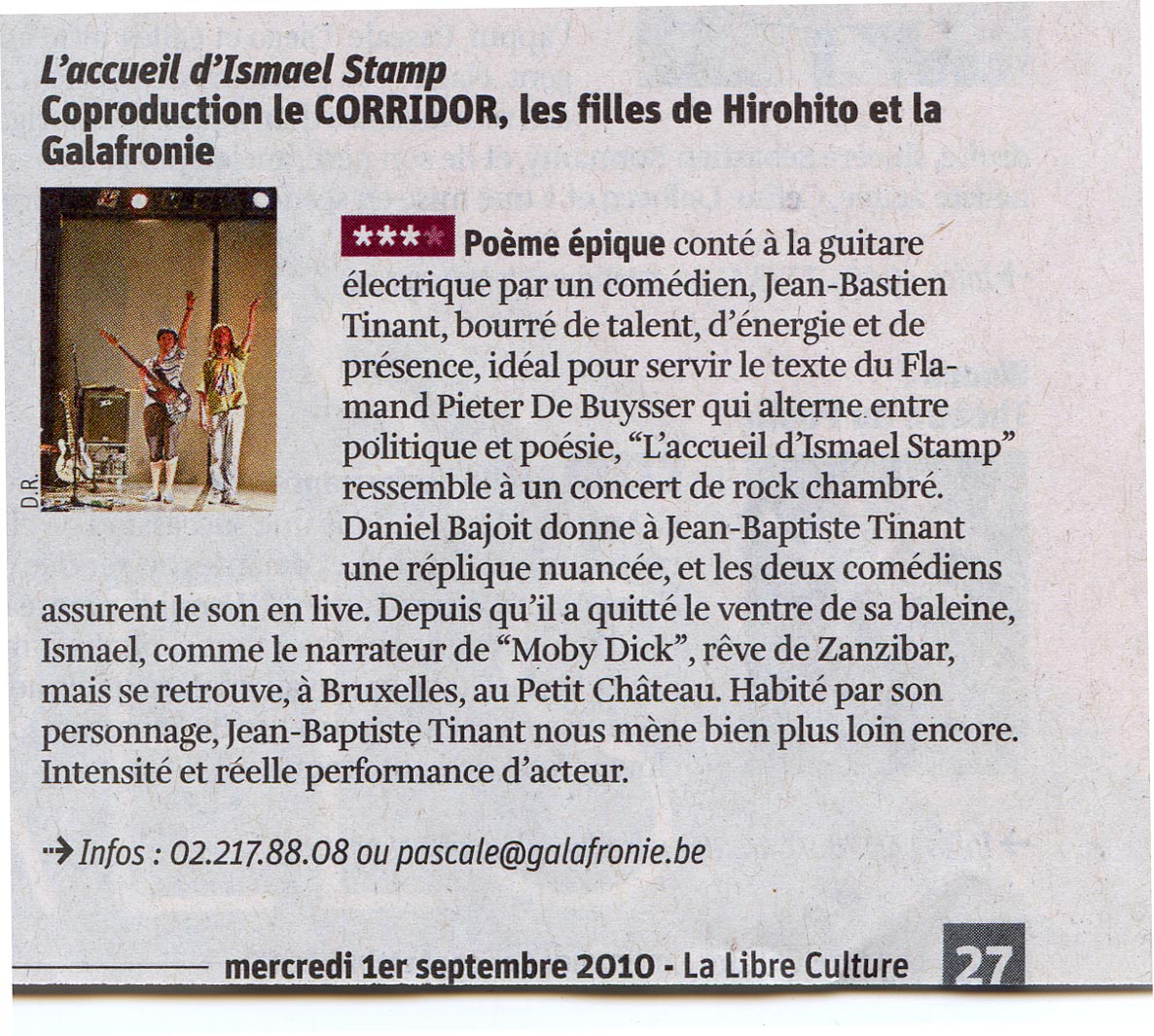 « Poème épique conté à la guitare électrique par un comédien, Jean-Bastien Tinant, bourré de talent, d‘énergie et de présence, idéal pour servir le texte du Flamand Pieter De Buysser qui alterne entre politique et poésie, « L’accueil d’Ismael Stamp » ressemble à un concert de rock chambré. Daniel Bajoit donne à Jean-Bastien Tinant une réplique nuancée, et les deux comédiens assurent le son en live. Depuis qu’il a quitté le ventre, Ismael comme le narrateur de « Moby Dick », rêve de Zanzibar, mais se retrouve à Bruxelles, au Petit Château. Habité par son personnage, Jean-Bastien Tinant nous mène bien plus loin encore. Intensité et réelle performance d’acteur. »