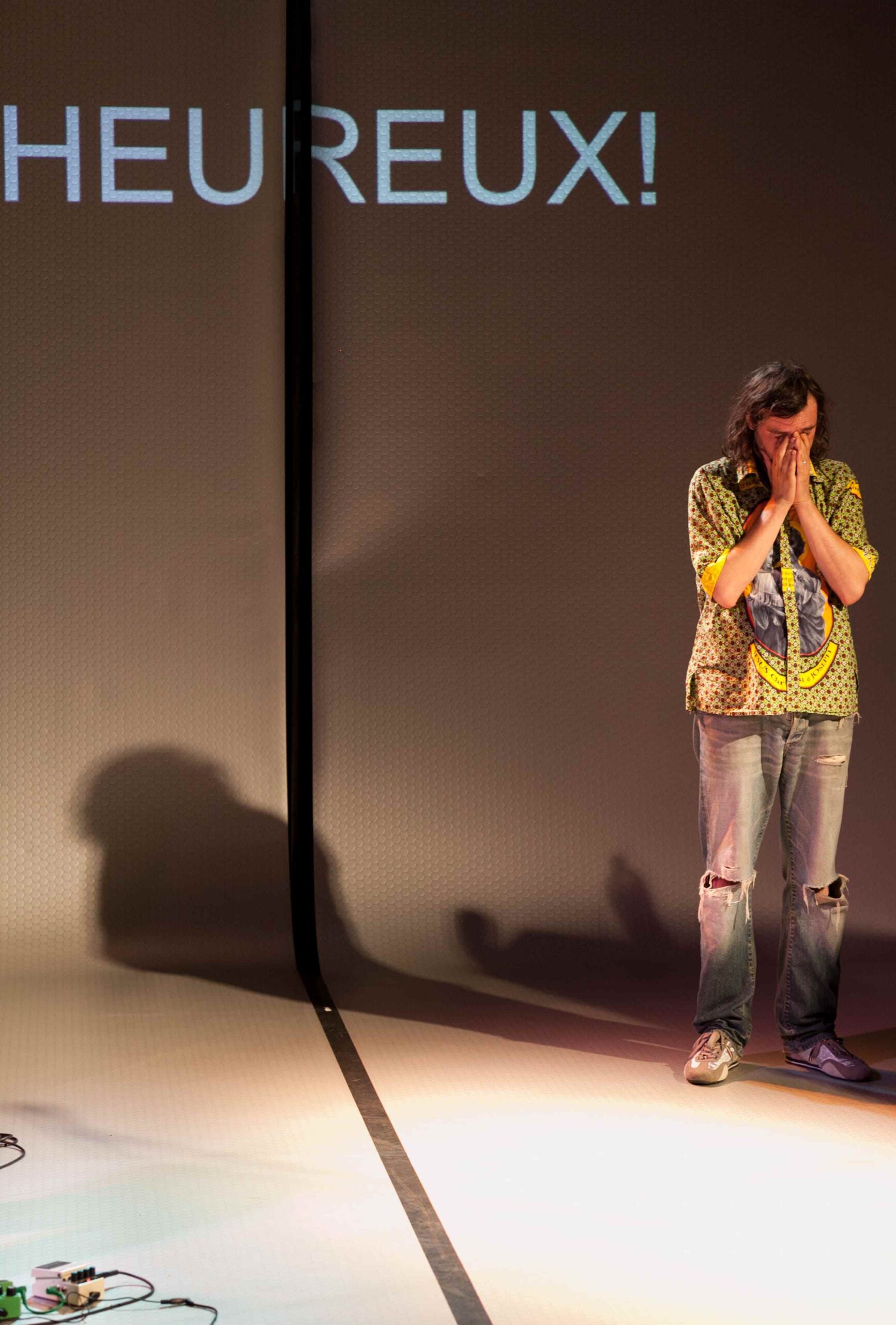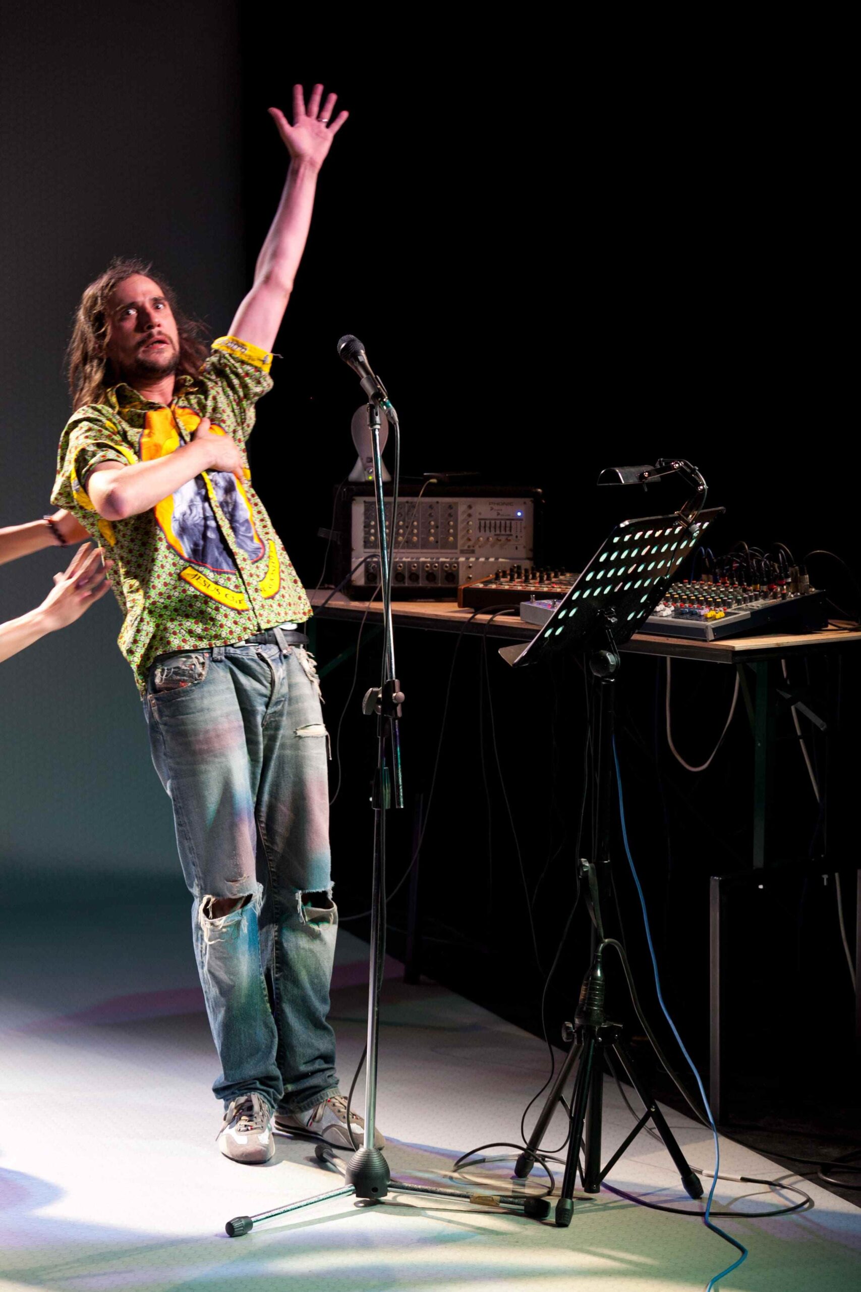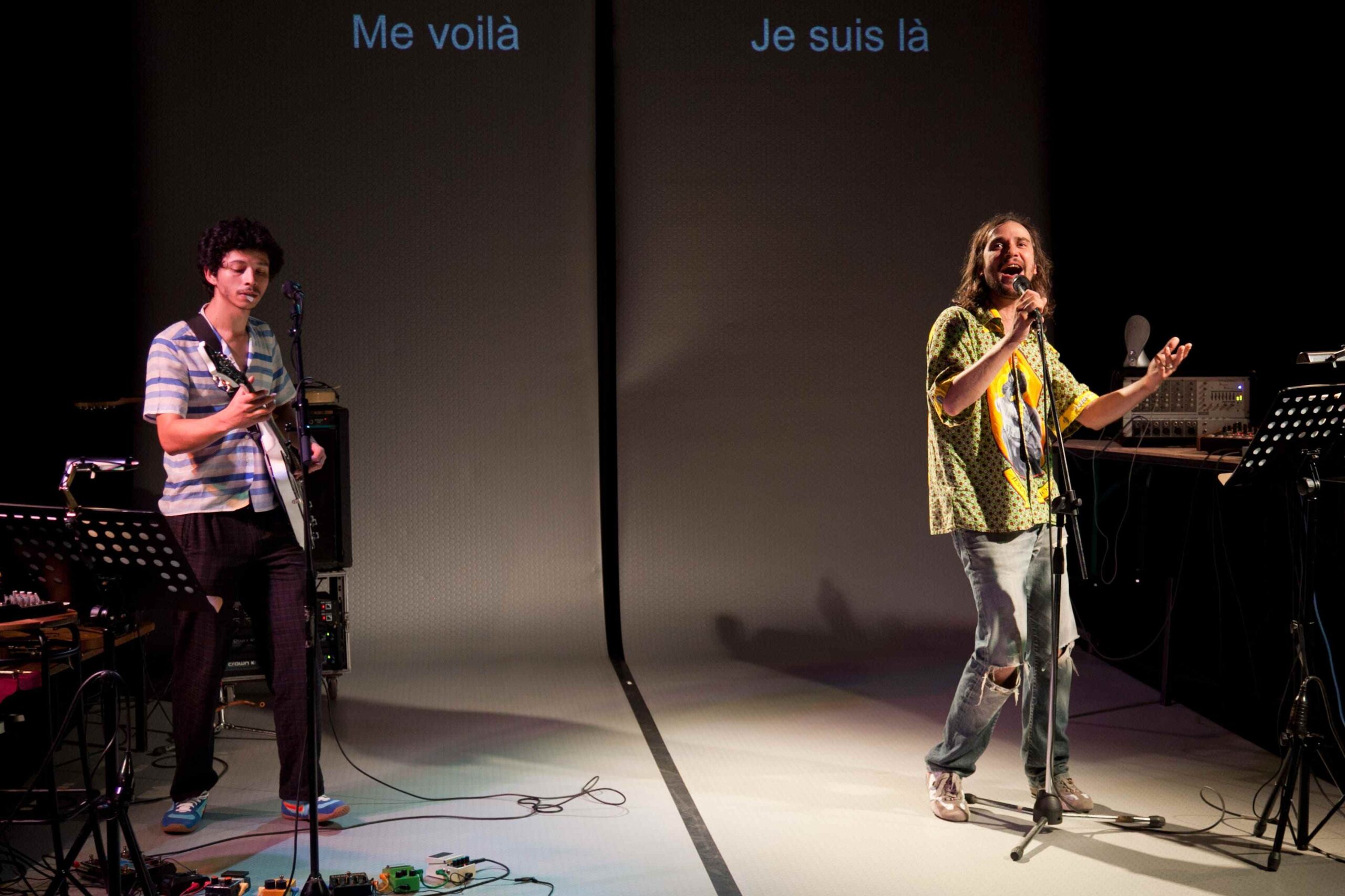 D’entrée de jeu, il est clair que ce ne sera pas du théâtre au sens traditionnel du terme. L’éclairage du plateau est celui, polychrome, d’un chanteur de variétés ou de rock. Le matériel étalé sur les planches est celui de musiciens doublés d’ingénieurs du son. La représentation commence à la façon d’un récit mis dans la bouche d’un conteur.…