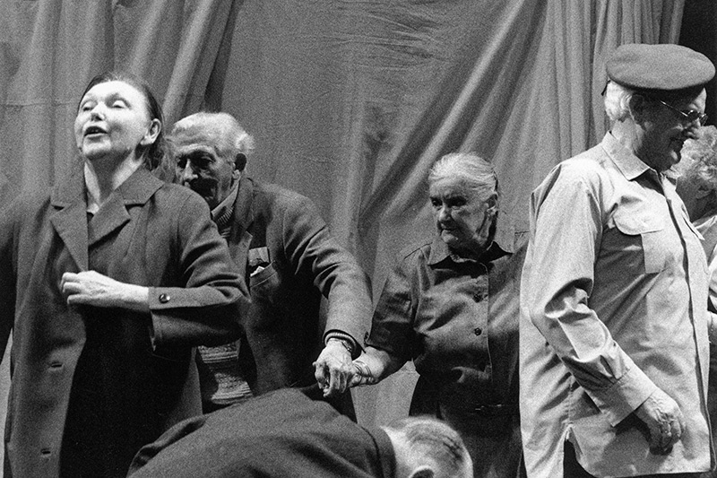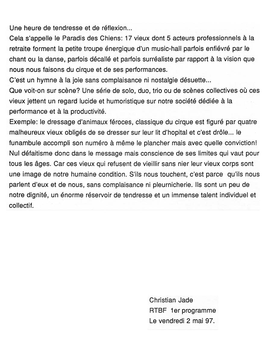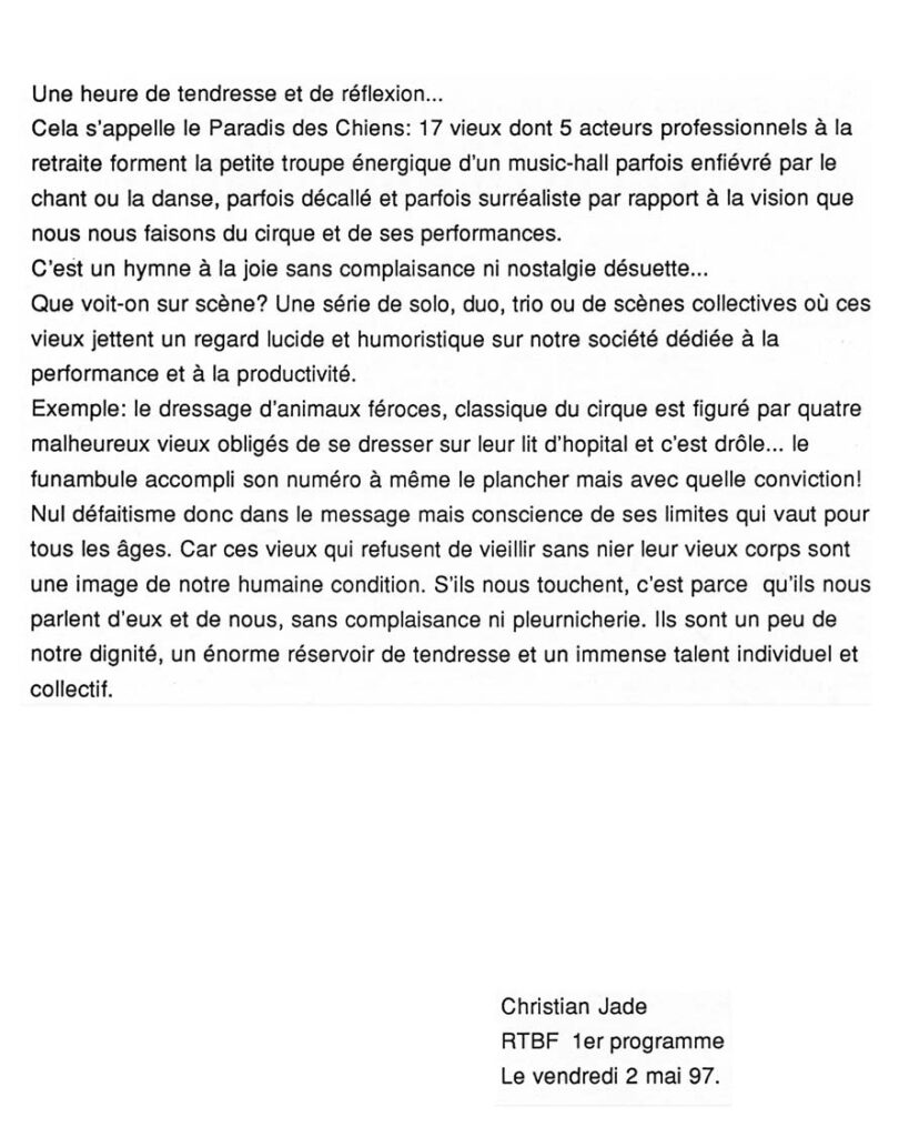 Les dix-sept vieux de la maison Saint-Michel ont décidé de se mettre ensemble pour sortir de leur torpeur et montrer au monde qu’ils sont toujours vivants. Ils ont préparé un grand spectacle de cirque et de music-hall. Tour à tour, dompteurs, magiciens, funambules, conteurs, chanteurs, ou musiciens, ils montrent au monde qu’il sont toujours là. Sous le masque des rides, il s’en vit des choses, il s’en raconte des histoires… Le grand cirque qu’ils ont préparé n’a bien sûr pas la virtuosité technique des Bouglione : pas de cumulets, pas de triple salto au programme, mais ce que l’on perd en prouesse, on le gagne en imagination et en humour, en poésie et en émotion, car derrière le cirque, c’est leur condition qui est en jeu : l’humiliation et l’oppression vécue au quotidien mais aussi leur volonté de résistance, leurs tentatives de rester en vie, d’être reconnus par l’environnement qui les entoure et leur volonté de rester enracinés dans le présent. Et si l’on associe habituellement le vieillard à des phénomènes de solitude, d’individualisme et d’incohérence, ici, la solidarité, la collectivité et l’organisation d’une résistance sont de mise pour dénoncer leur mise au banc de la société. Pour que finalement notre tragédie humaine se transforme en vie gagnée sur le monde, sur la mort. En force de vie, tout simplement.