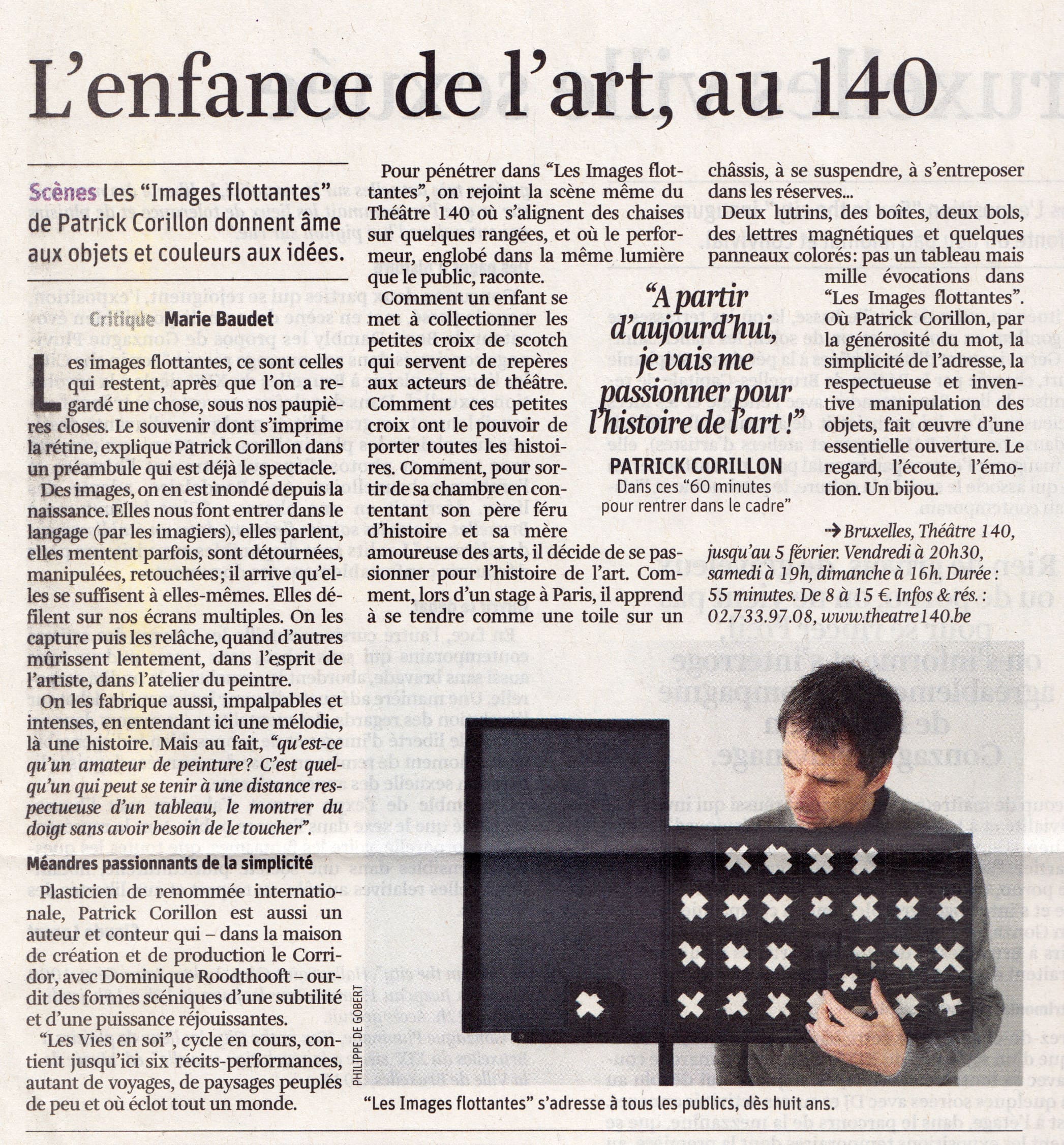 Dans ce récit, Patrick Corillon propose une heure de voyage dans le monde des images sans jamais nous en montrer une. Il y raconte l’histoire d’un petit garçon transporté dans ce monde imaginaire. Il apprendra, grâce à un stage d’initiation à la peinture dans un musée d’Art moderne, à sortir de lui-même et en quelque sorte à sortir du cadre pour découvrir le monde. Tout part d’un souvenir, matérialisé par quelques éléments importés dans la salle du musée : un lutrin et quatre boîtes enfermant de petits objets ayant une grande force symbolique. À l’aide d’un dispositif scénographique minimal, Patrick Corillon prend le spectateur par la main et par le coeur, pour le sortir du monde des images imposées et lui donner tout pouvoir d’inventer lui-même de nouvelles histoires.