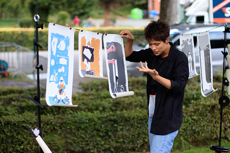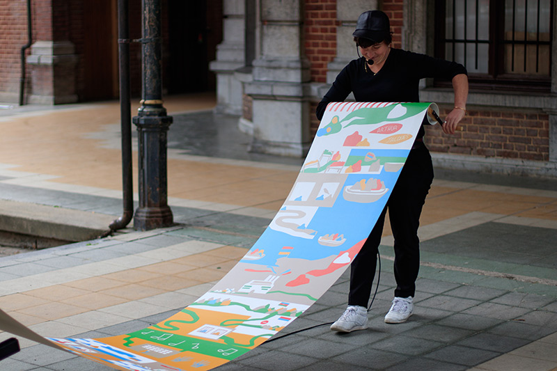 Le travail artistique de Dominique Roodthooft s’attache toujours à l’humain et sa puissance de vie, quoi qu’il arrive. Elle a imaginé Patua Nou, une démarche d’art vivant dans la rue. Elle s’inspire de la coutume des patachitras, dispositifs d’art narratif chantés et représentés sur rouleau. Les patua (conteurs originaires du Bengale de l’Ouest) peignent eux-mêmes des rouleaux sur lesquels ils illustrent suivant la tradition des témoignages, des contes ou des poésies. Puis ils déroulent leurs images qu’ils interprètent sous forme mélodique en situant du doigt la progression du récit. Dominique Roodthooft transpose ce principe de récit imagé pour créer de nouvelles histoires en lien avec l’exil au sens large. Et ces nouvelles histoires dessinées sont mises en musique par Pierre Kissling et chantées, pour la plupart, par des jeunes acteur.rice.s. Et si la thématique fait écho aux migrations contemporaines, le chant et le dessin, permettent d’aborder la question de façon joyeuse et poétique : s’éloigner de l’actualité directe ne veut pas dire fuir le réel mais s’y confronter avec un regard bienveillant, questionneur, éloigné de la peur ou de la souffrance qui empêche de penser. Refuser la doxa d’un certain présent douloureux pour opérer un retour sur les fondements de l’existence. L’exil comme mouvement vital et universel vers l’ailleurs.