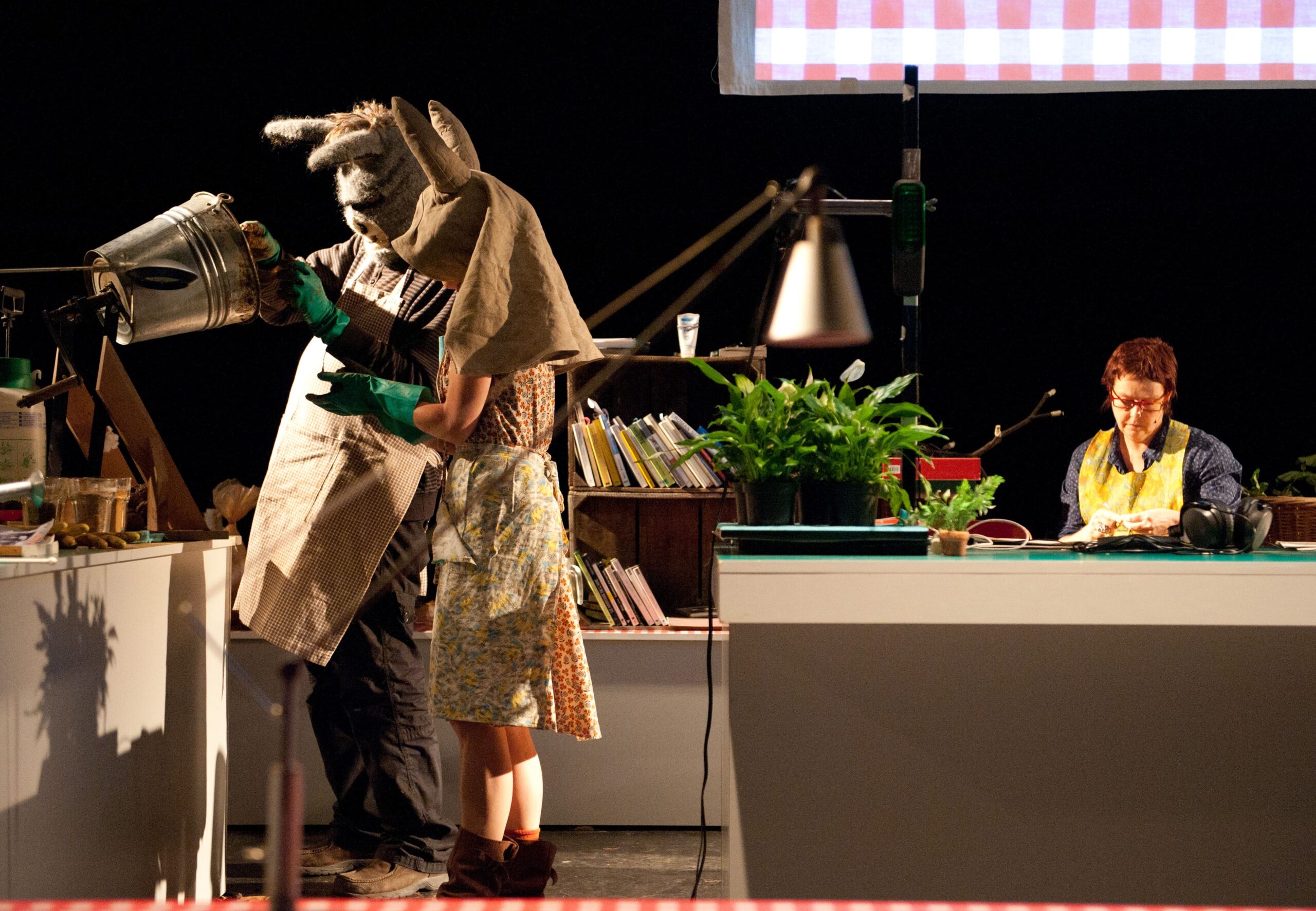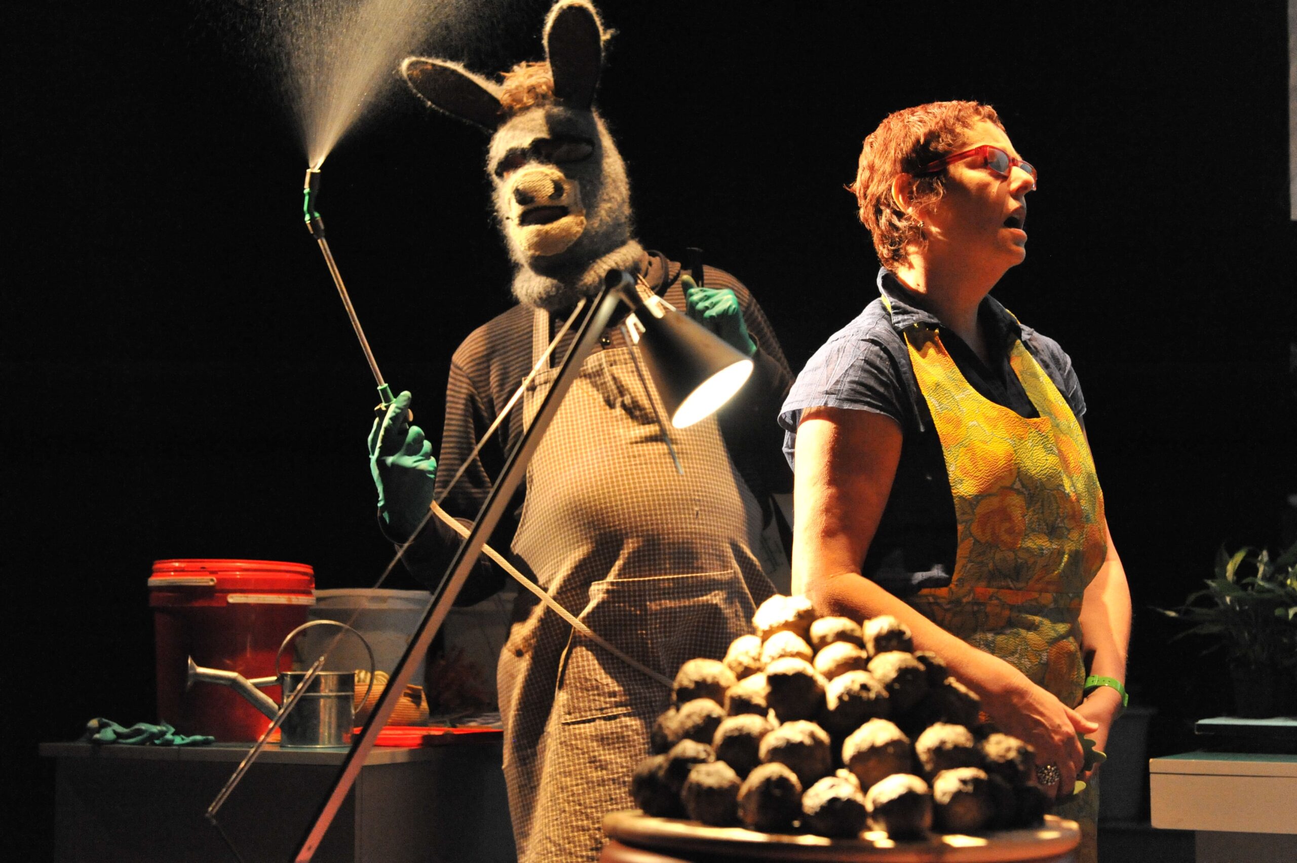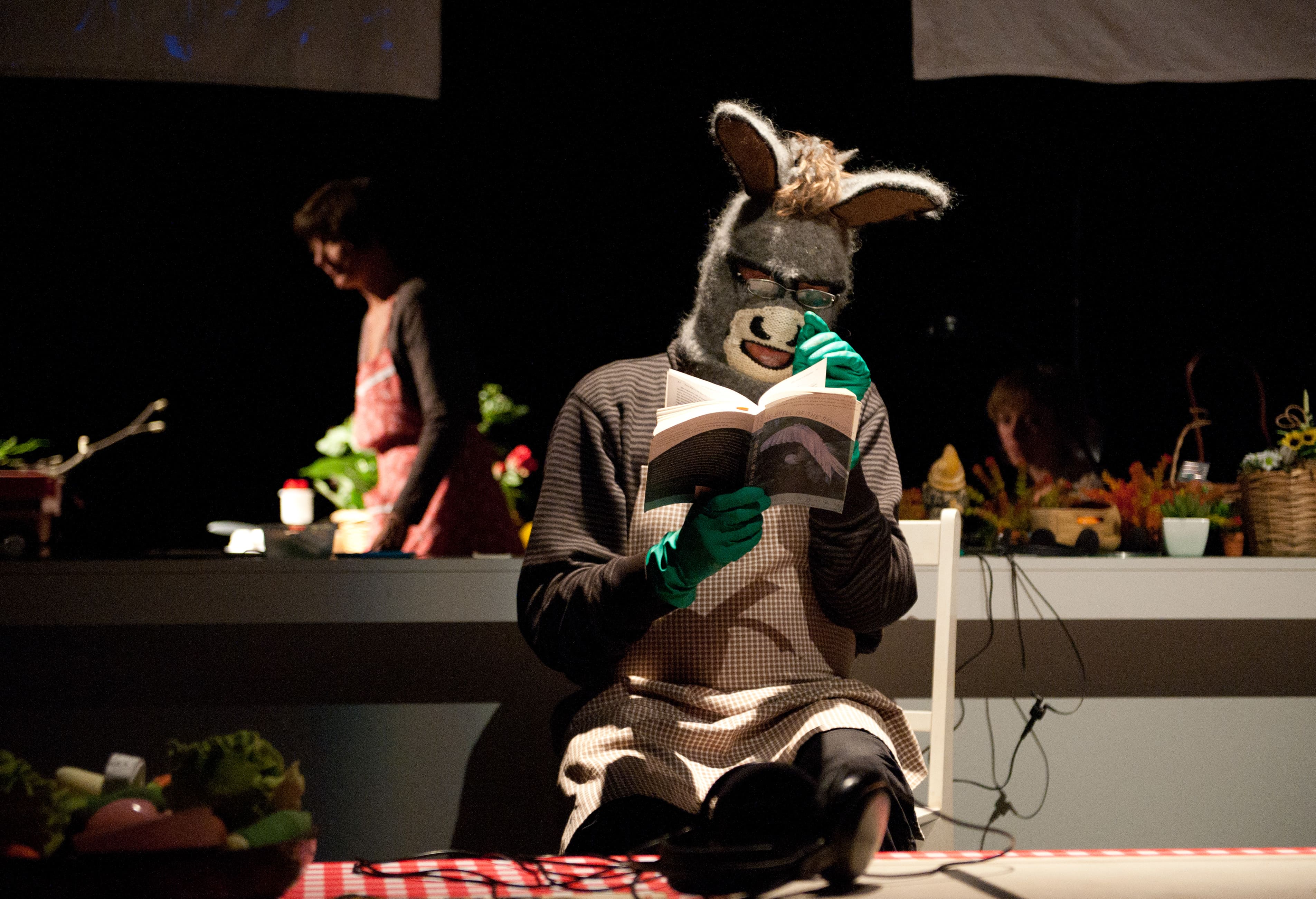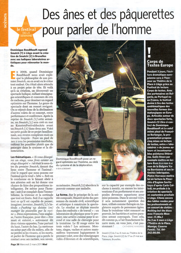 Nous vivons dans une période spectrale, dans laquelle la mort, et la finitude de l’homme sont sans cesse énoncées et à certains endroits, consciemment planifiées. Dans SMATCH[2], nous passons par le relation sensible de l’homme aux végétaux et à la terre pour parler de la question de la vie même de l’homme et de son déracinement. Jardiner à la recherche de signes de vie en partant du milieu, afin de ne perdre ni les morts, ni les vivants. Le point de départ est un film où l’on voit, dans une chambre d’hôpital en Angleterre, un vieux monsieur caresser un âne dans le silence, pendant 8 minutes. C’est cette relation sensible de l’homme à la culture qui est explorée. Sa rupture avec l’expérience de la nature. L’écriture est basée sur des documents ou expériences scientifiques (un élevage de lombrics sur le plateau, une distillation de fruits récoltés avec une vieille casserole à pression, …), des récits populaires, la rencontre avec un âne qui favorise l’émergence de la mémoire, une ode à la pomme de terre, au vent ou au vers de terre.