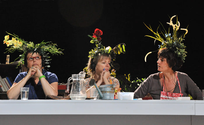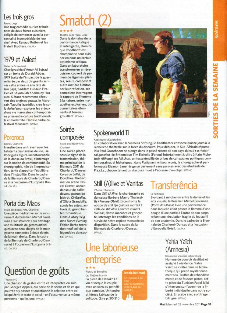 Tout est à l’avenant, nous prenant sans cesse par surprise au fil des discours philosophiques. On y croise une femme-arbre. On y interroge la volonté d’une pomme de terre. On y rencontre un âne thérapeute pour vieillards. On y apprend la fabrication des «seed bombs» (grenades de semences) et on y fabrique tornades, volcans et tsunamis. Le rapport entre la nature et la culture y est central, qu’on y parle de plantes vagabondes ou des pets de fromage. Comme quoi la biodiversité, ça pousse aussi sur les planches.Le Soir, Catherine Markereel, 19/05/11