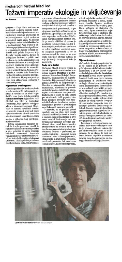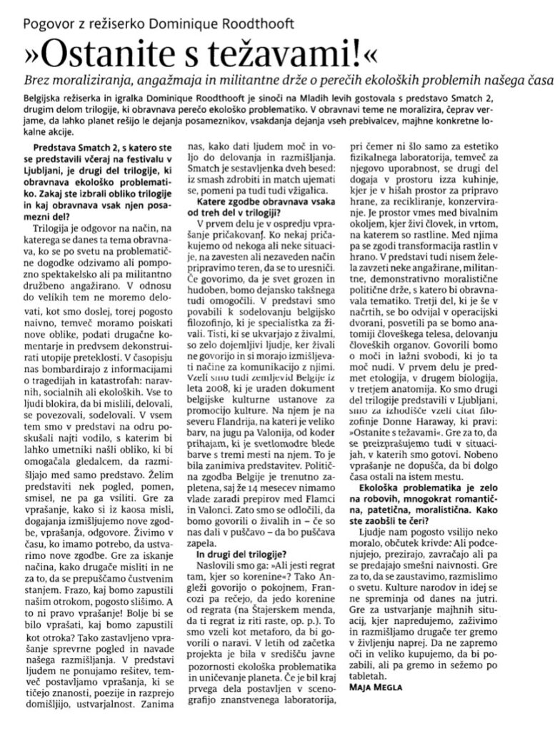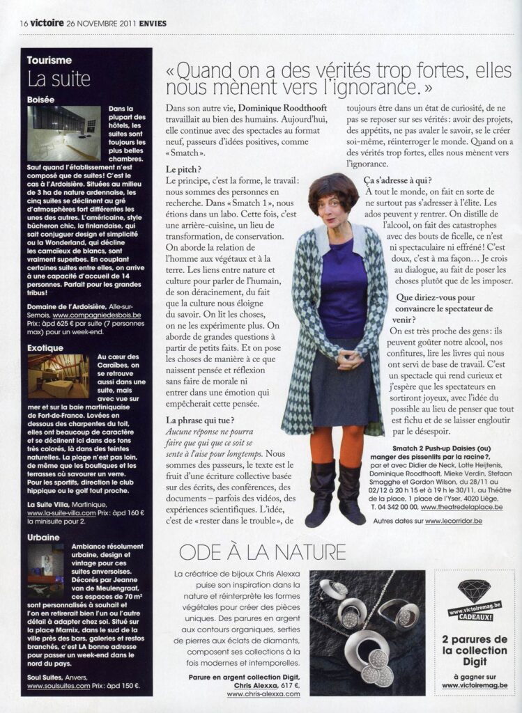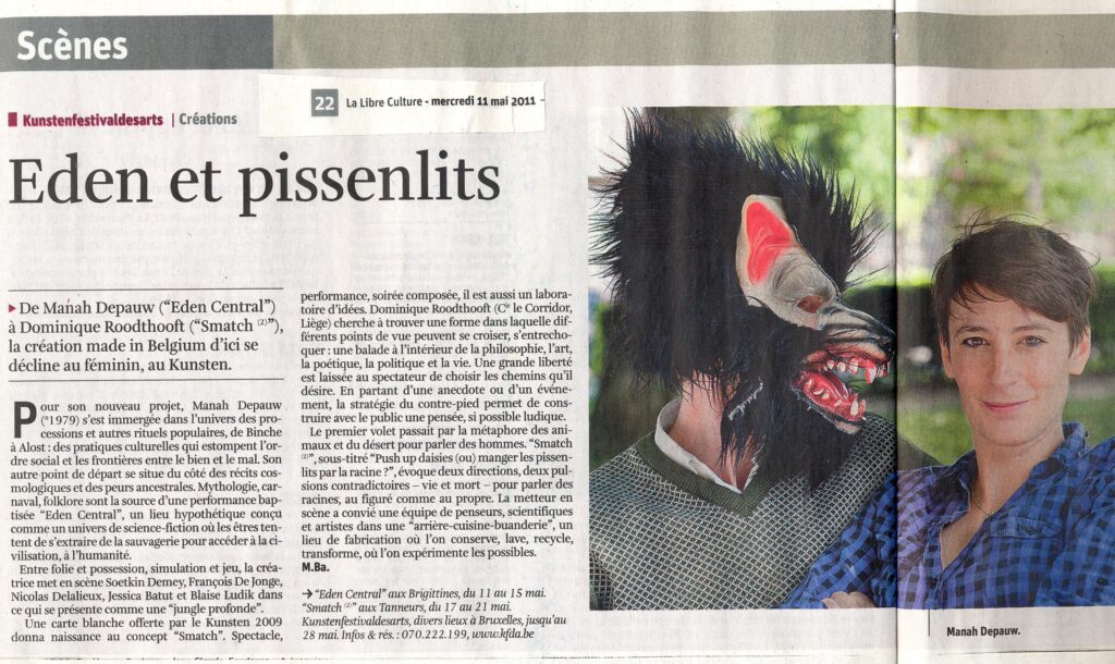 Dans les mélanges livrés ici, un théâtre neuf jaillit. Hors de la fiction, loin du jeu, mais au plus près de la transmission. En empruntant des propos, des concepts, des extraits de conférences (entre autre de Gilles Clément et son «Tiers Paysage», de Robert Harisson et son essai sur la survivance des forêts dans l’imaginaire occidental, du botaniste et biologiste Francis Hallé, spécialiste de l’écologie et des forêts tropicales humides…), Dominique Roodthooft réussit néanmoins une construction – quoiqu’encore fragile – surpasse la somme des parties. Une mosaïque cohérente qui n’oublie jamais la dérision. Une plongée concrète et poétique dans la pensée de ce qui nous fonde et que si souvent nous oublions.La Libre Belgique, Marie Baudet, 19/05/11