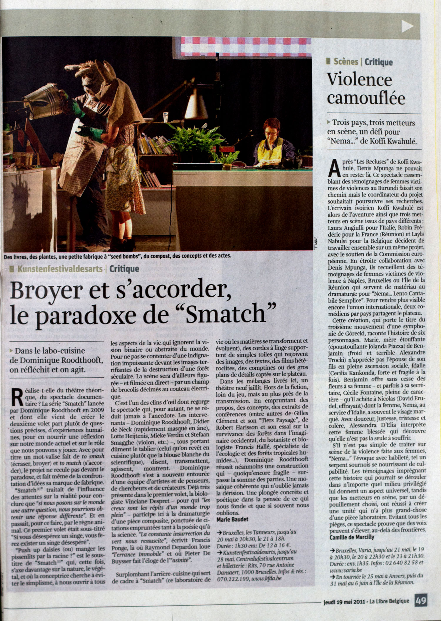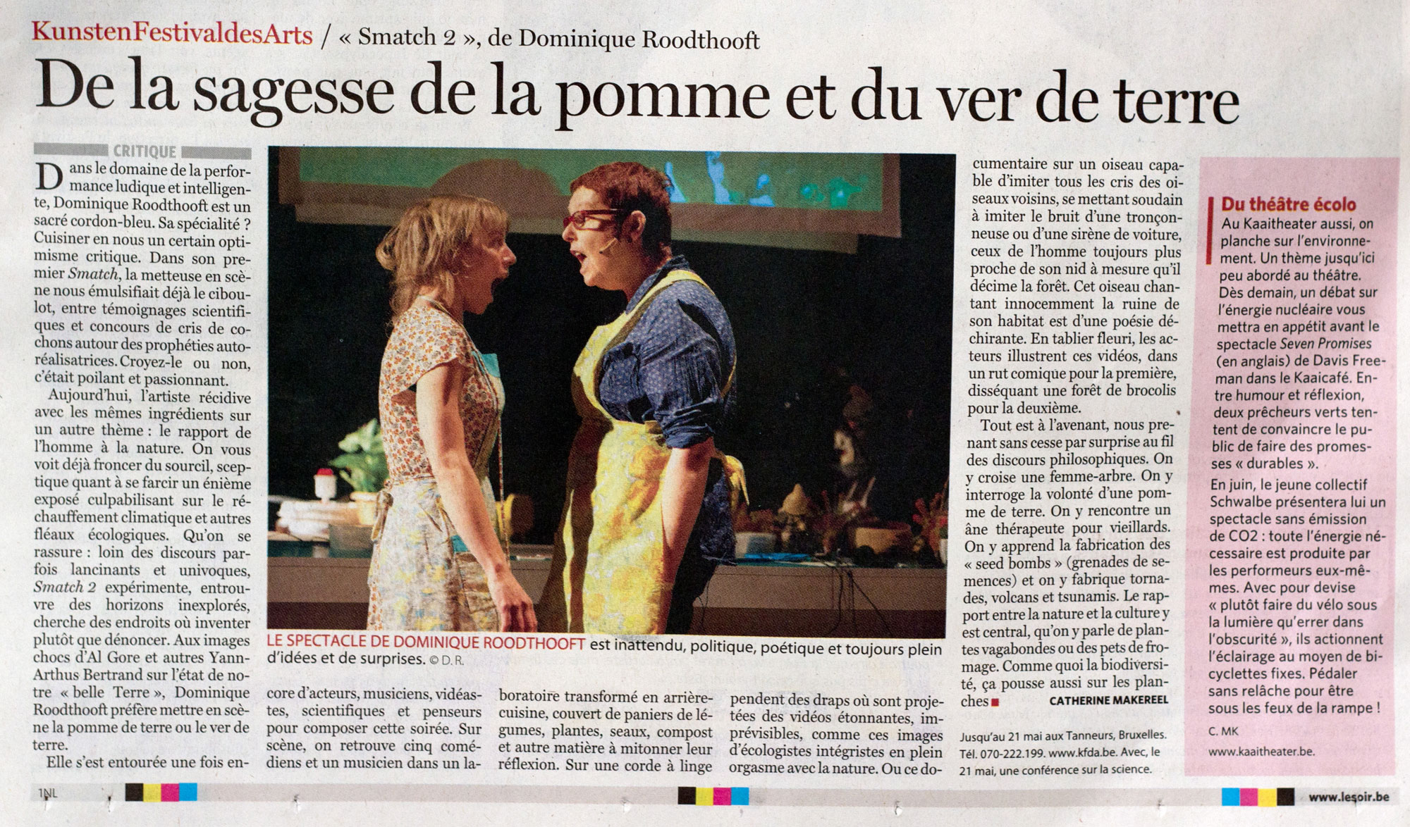 Tout est à l’avenant, nous prenant sans cesse par surprise au fil des discours philosophiques. On y croise une femme-arbre. On y interroge la volonté d’une pomme de terre. On y rencontre un âne thérapeute pour vieillards. On y apprend la fabrication des «seed bombs» (grenades de semences) et on y fabrique tornades, volcans et tsunamis. Le rapport entre la nature et la culture y est central, qu’on y parle de plantes vagabondes ou des pets de fromage. Comme quoi la biodiversité, ça pousse aussi sur les planches.Le Soir, Catherine Markereel, 19/05/11