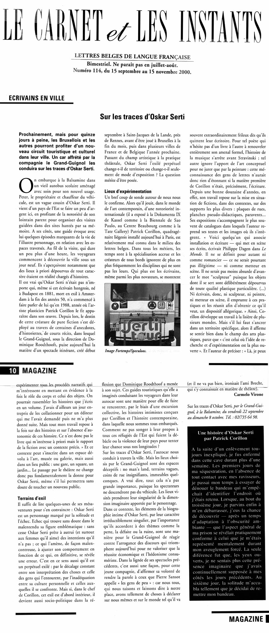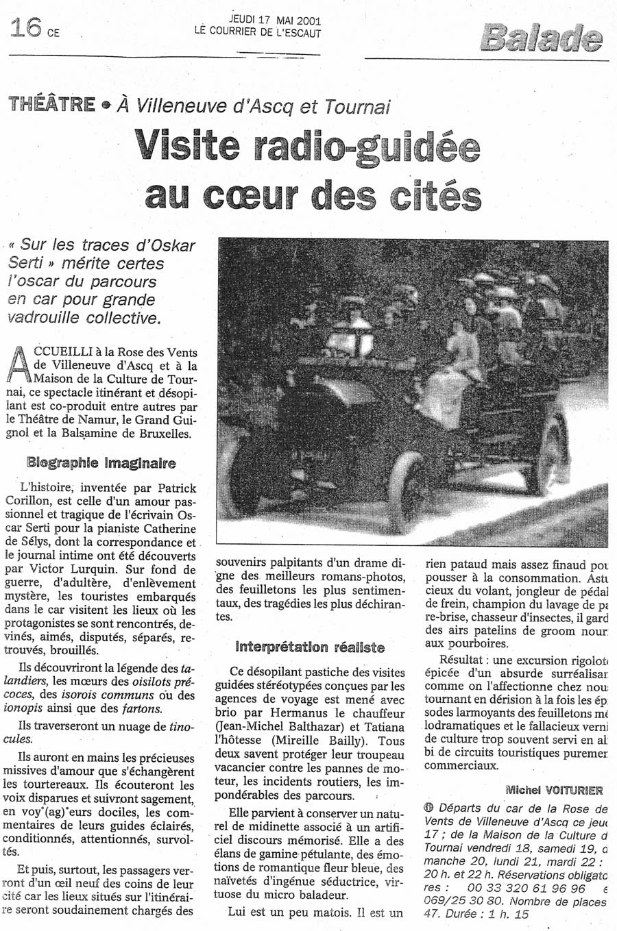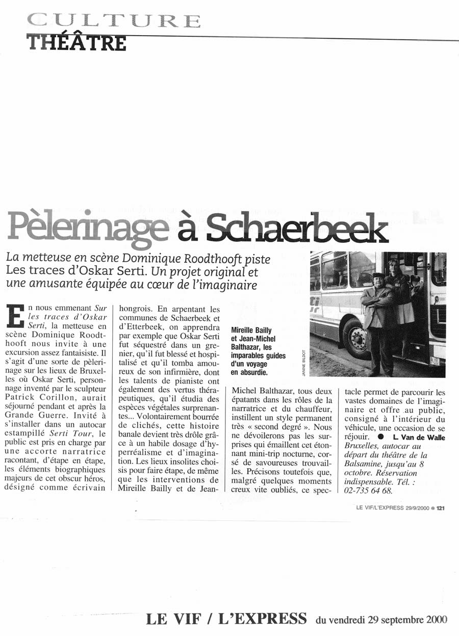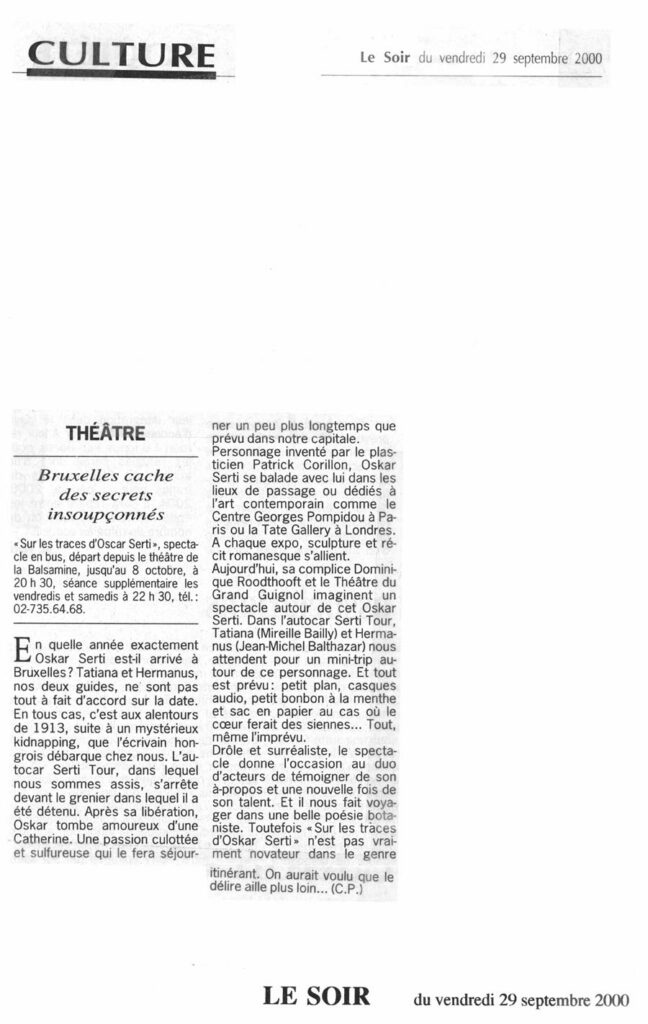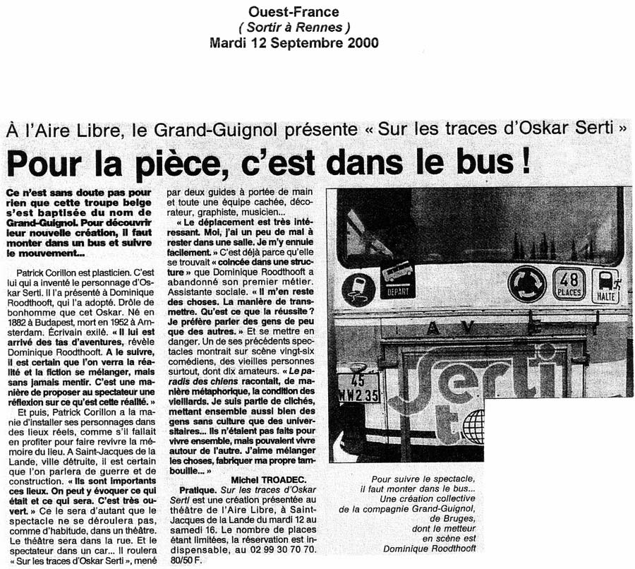 Ce spectacle a pris la forme d’une visite guidée en car dans laquelle la réalité des lieux et les aventures fictionnelles d’Oskar Serti se rejoignent étroitement pour devenir finalement un voyage au cœur de l’imaginaire de chacun.