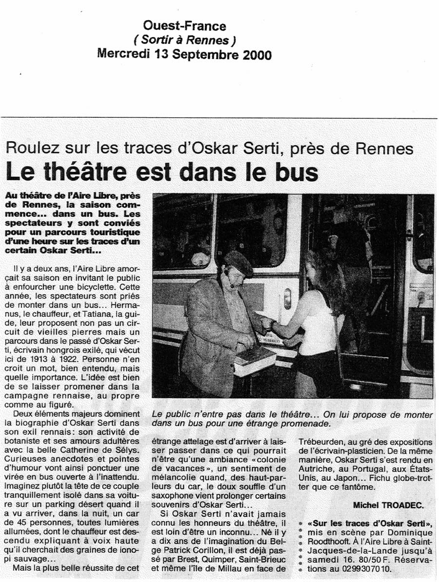 Deux éléments majeurs dominent la biographie d’Oskar Serti dans son exil rennais : son activité de botaniste et ses amours adultères avec la belle Catherine de Sélys. Curieuses anecdotes et pointes d’humour vont ainsi ponctuer une virée en bus ouverte à l’inattendu…Mais la plus belle réussite de cet étrange attelage est d’arriver à laisser passer dans ce qui pourrait n’être qu’une ambiance « colonie de vacances », un sentiment de mélancolie quand, des hauts-parleurs du car, le doux souffle d’un saxophone vient prolonger certains souvenirs d’Oskar Serti…